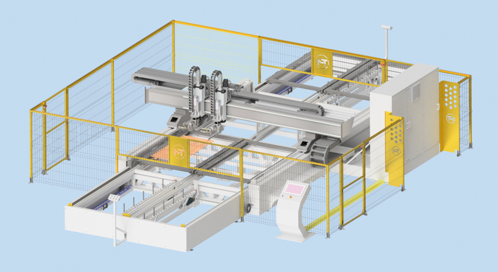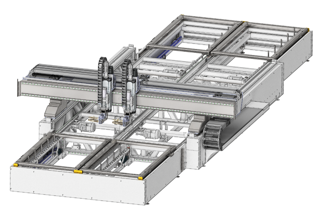 Wszystkie osie napędzane są za pomocą najnowocześniejszych silników serwo od Bosch Rexroth, zapewniających niezawodność i precyzję. Na naszym moście jeżdżącym można zamontować maksymalnie 5 supportów w dowolnej konfiguracji (gwoździarki, sztyfciarki), co umożliwia jeszcze większą elastyczność w procesie zbijania.