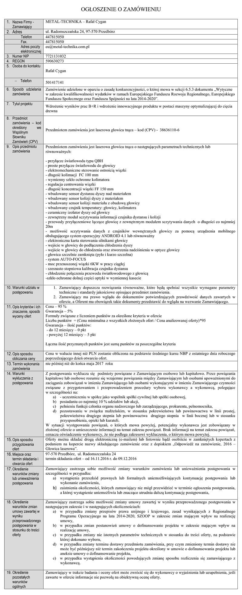 Ogłoszenie o zamówieniu – głowica